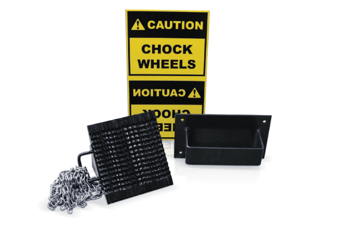 Los kits de seguridad para calzos de ruedas Blue Giant ofrecen mayor protección contra la separación accidental del remolque. Cada kit incluye un calzo laminado o moldeado con una cadena de 4,6 m (15') y un letrero recordatorio de calzo con imagen invertida.- Folleto de calzos para ruedas BlueGiant.General.DocumentOnlyAvailableInglés